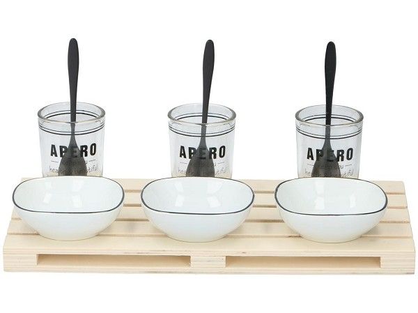 Deze set is helemaal compleet. Hij bestaat uit een houten tray van 28 x 15 x 2 centimeter. De tray is aan beide kanten uitgerust met draaghendels van touw. Verder horen er 3 aardewerken bakje bij. Deze zijn wit met een zwart randje. Ook zijn er 3 glaasjes waar het woord ‘Apero op staat en 3 lepeltjes.