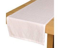 Damast tafelloper wit met moderne golvende lijnen. De tafelloper is van 40 % katoen en 60 % polyester. Afmeting 45 x 140 cm. Geschikt voor de wasmachine.